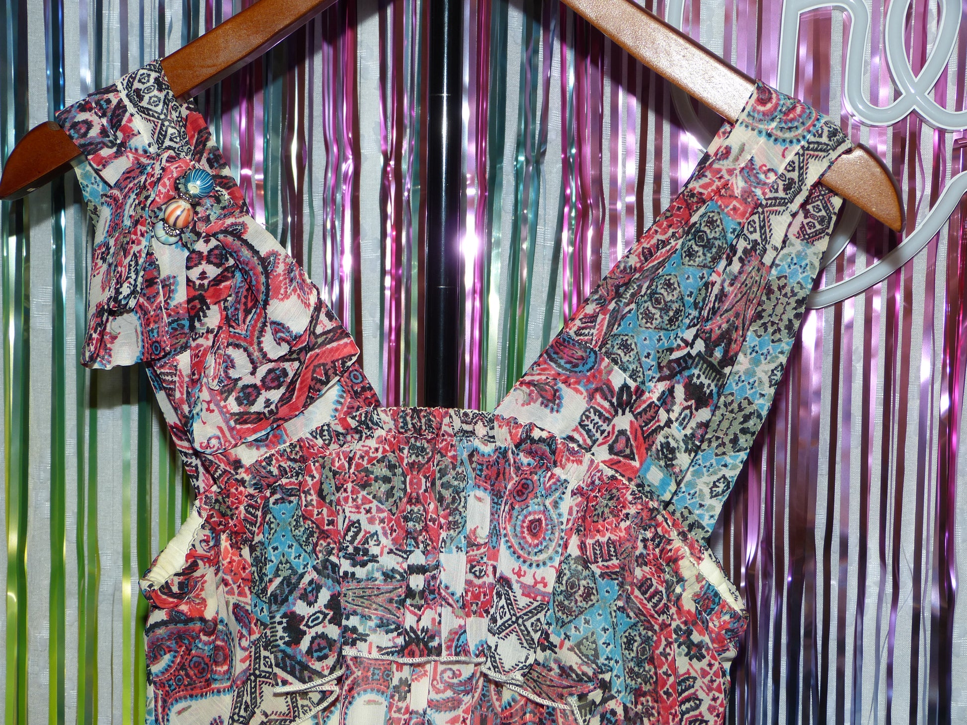 Channel effortless bohemian charm with this colorful ruffle sleeve sundress. Featuring a vibrant mix of paisley and tribal-inspired prints in shades of coral, blue, and cream, this dress is both eye-catching and flattering. The smocked bodice and ruffle-trimmed straps add a playful feminine touch, while the braided tan belt cinches the waist to create a beautiful silhouette. Lightweight and flowy—perfect for summer days, festivals, or casual outings.