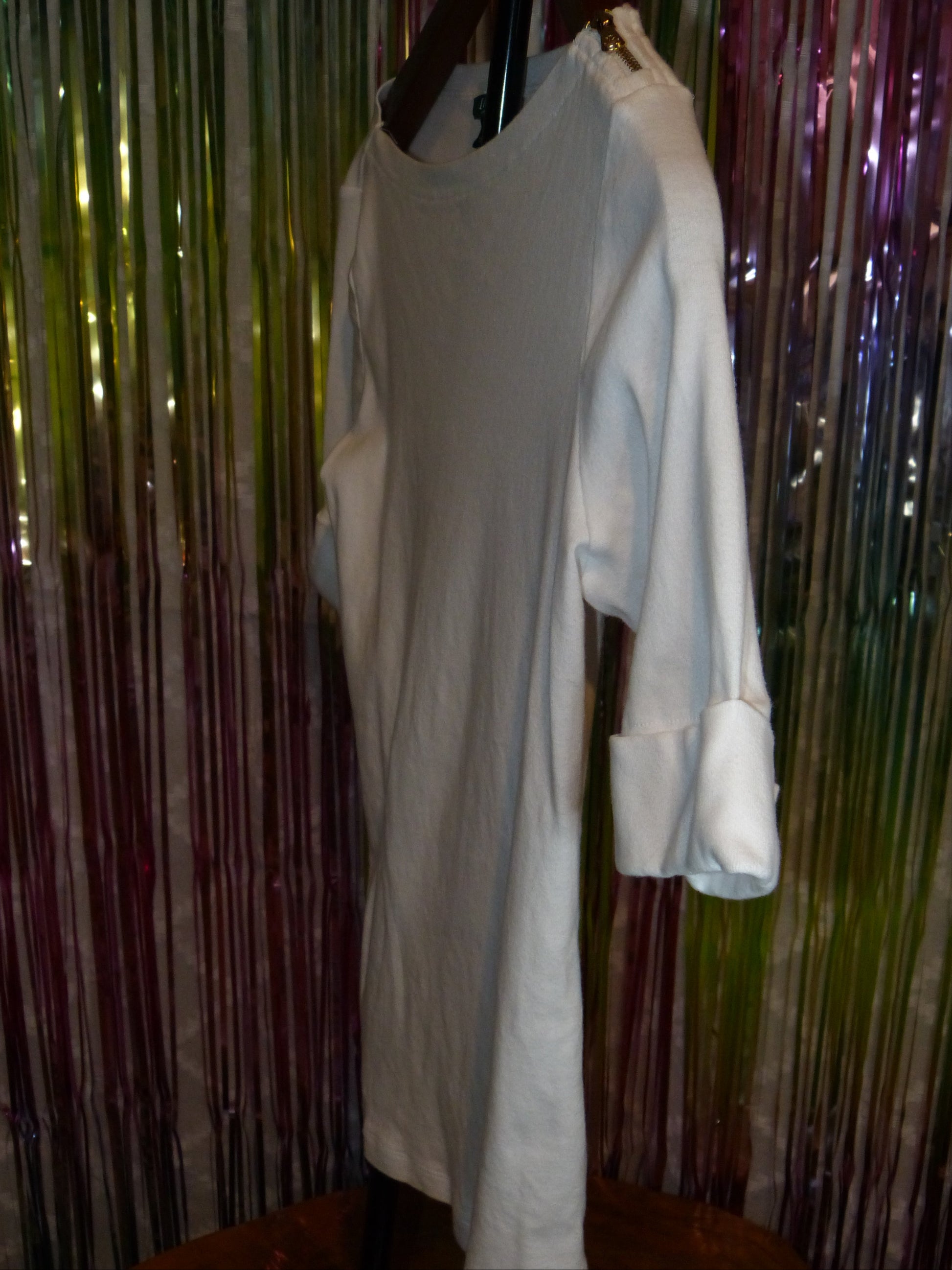 Features: Elbow-length sleeves, gold shoulder zipper, boat neckline
