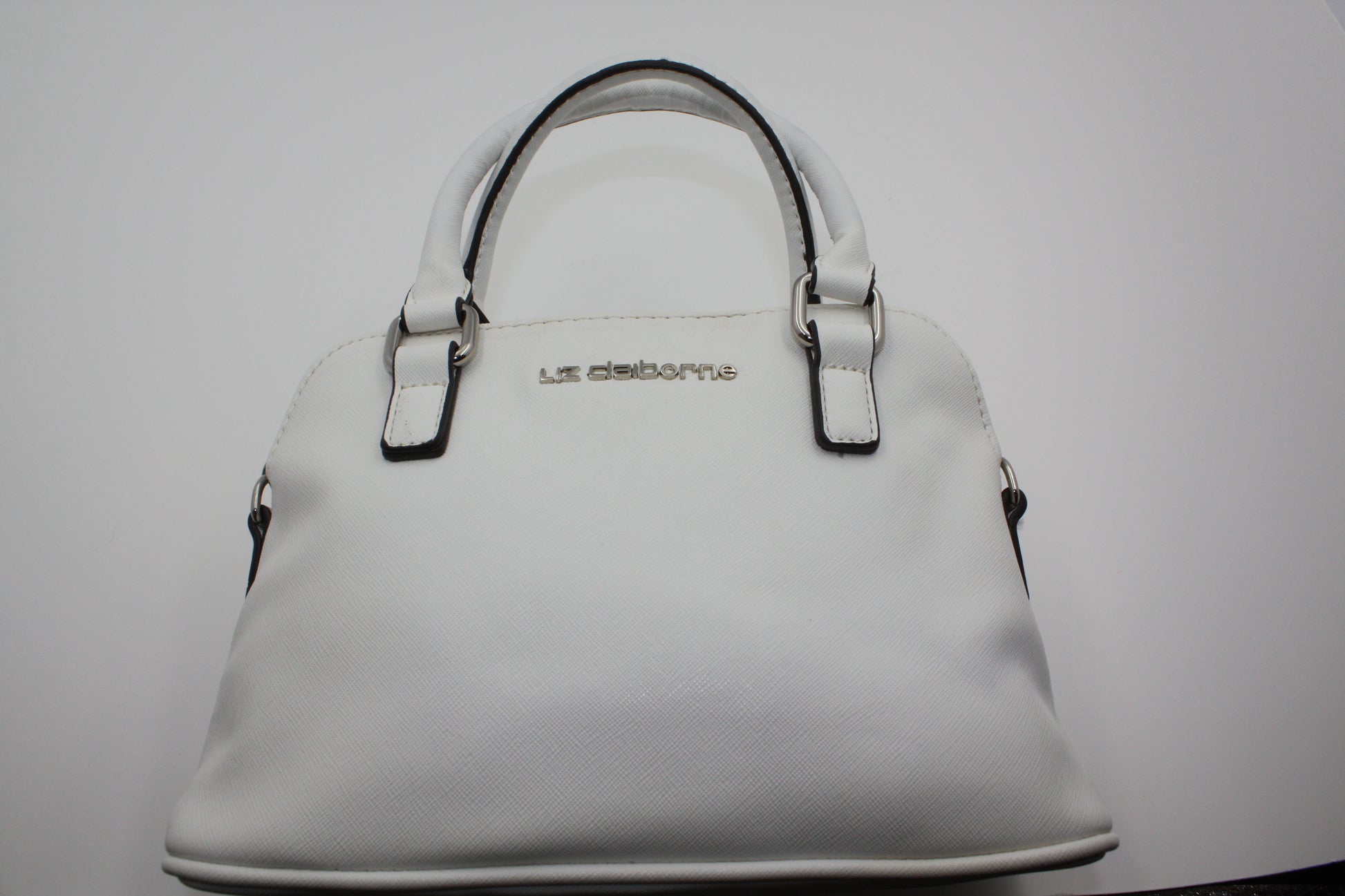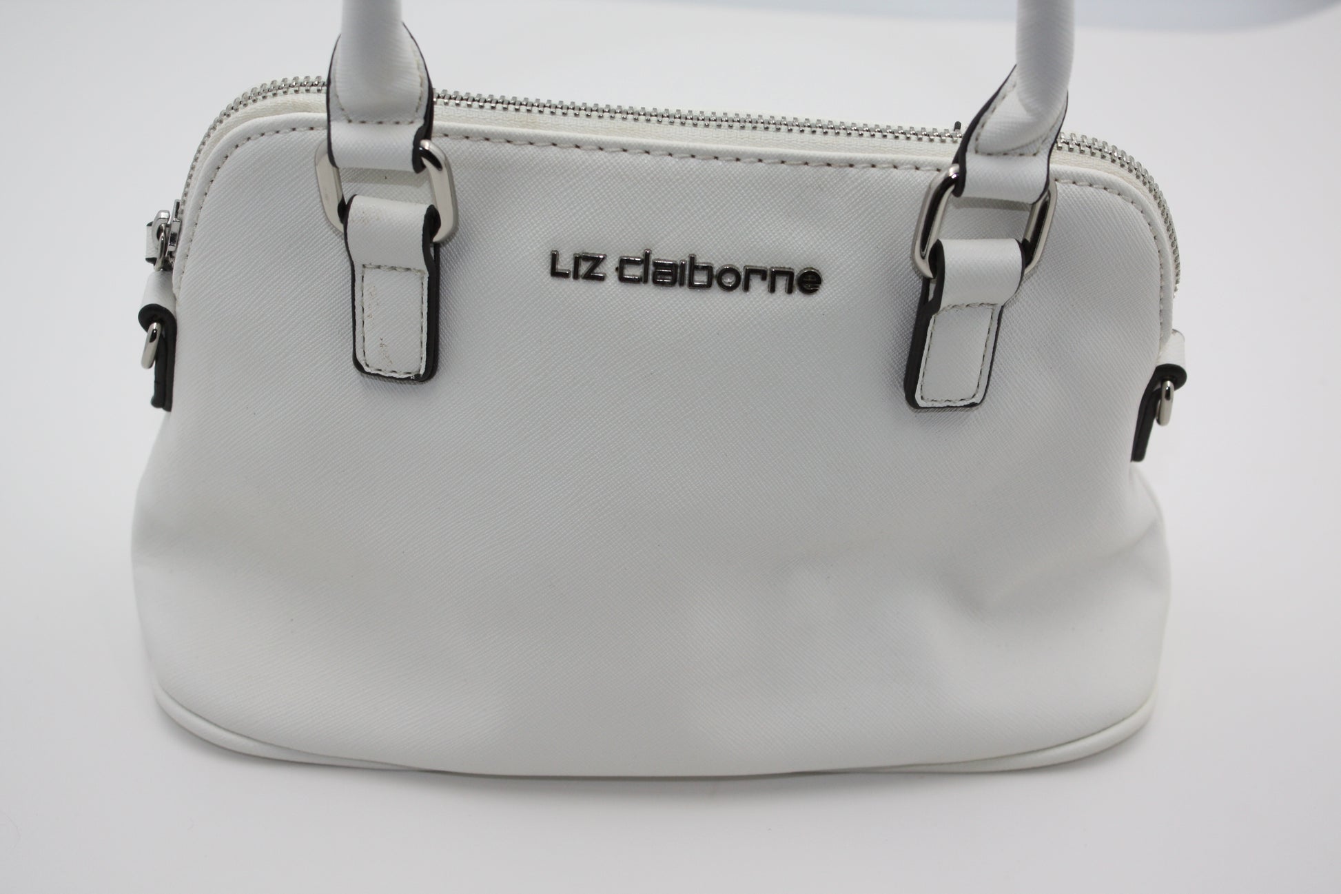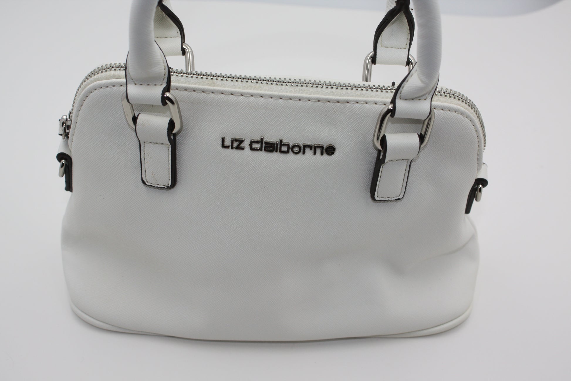 Chic, compact, and timeless—this Liz Claiborne white satchel brings classic sophistication to any outfit. With its structured shape, dual rolled handles, and silver-tone hardware, it's perfect for both polished workwear and off-duty elegance.